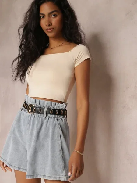 Other Blugi scurți albaștri cu talie înaltă cu din imitație de piele cu aspect uzat Tiamathy