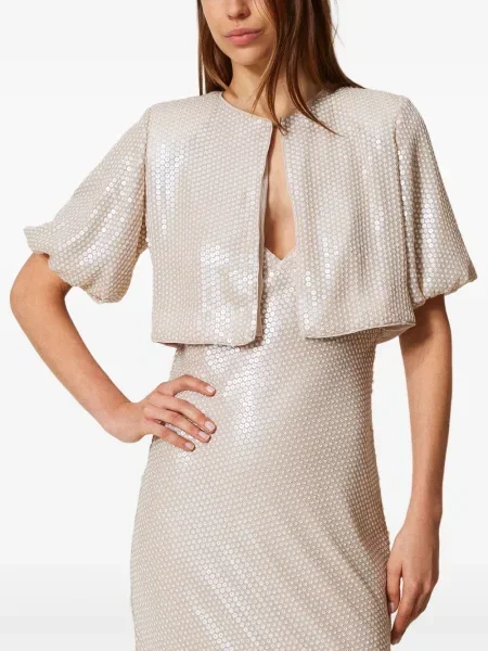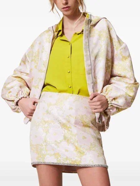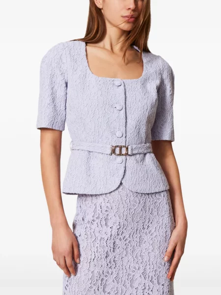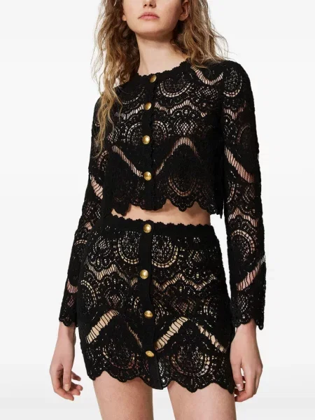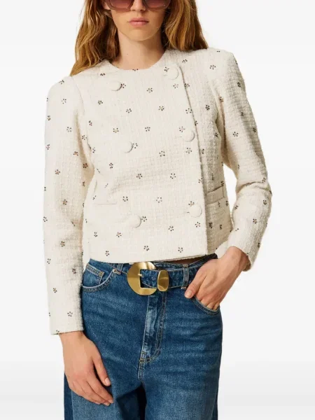 Jachete Twinset pentru femei se remarcă prin combinații de tricot cu chiffon sau dantelă, iar materialele folosite variază de la tricotaje și mătase la piele și finisaje tehnice, toate cu accente ornamentale vizibile. Aceste piese sunt distribuite prin 4 magazine și parteneri, ceea ce permite selecții variate în funcție de finisaj și ocazie.