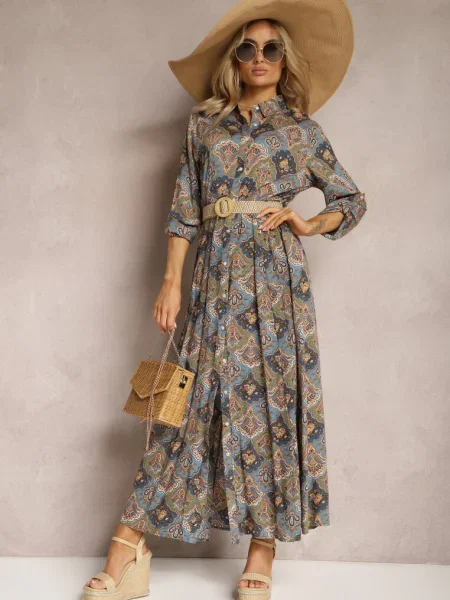 Rochie Cămașă Albastru-Verde cu Model Paisley Zeli