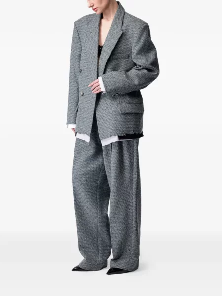 Croiul schimbă complet tonul ținutei. Un model scurt, tip Chanel, arată excelent cu rochii, jeanși drepți și pantaloni cu talie înaltă. Un sacou clasic, ușor cambrat, intră firesc într-o garderobă office. Varianta oversized are un aer mai relaxat și funcționează bine cu tricouri fine și loafers. Contează umerii, reverul, lungimea și felul în care se închide: unul sau doi nasturi, nasturi metalici, margini franjurate sau finisaje curate.